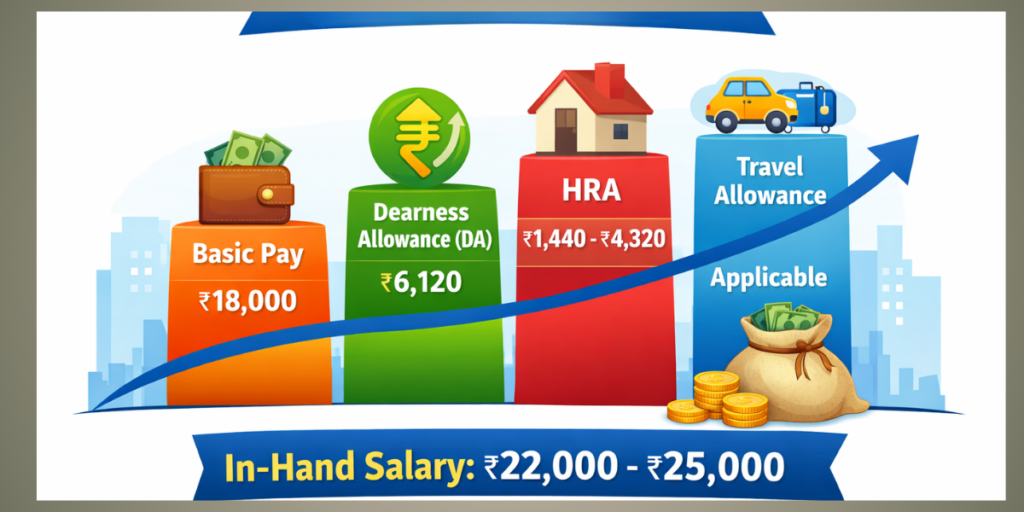 Railway group D salary in hand is around₹22,000 – ₹25,000 vary posting to the city.